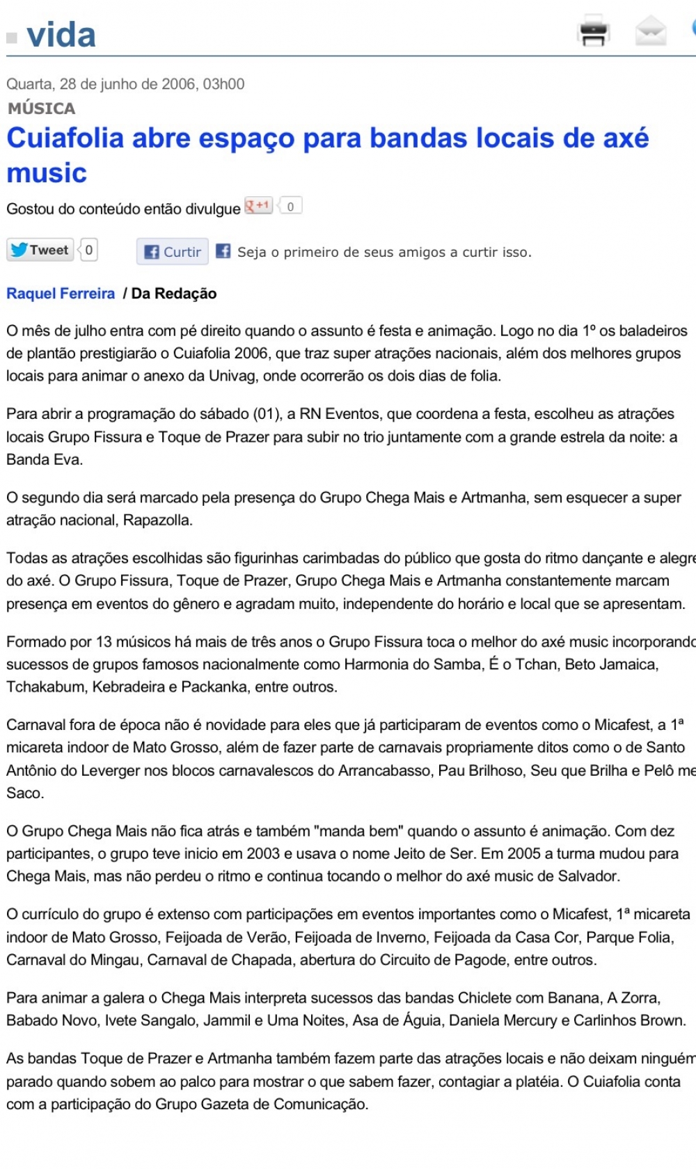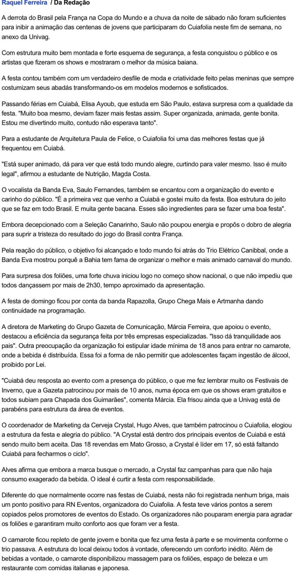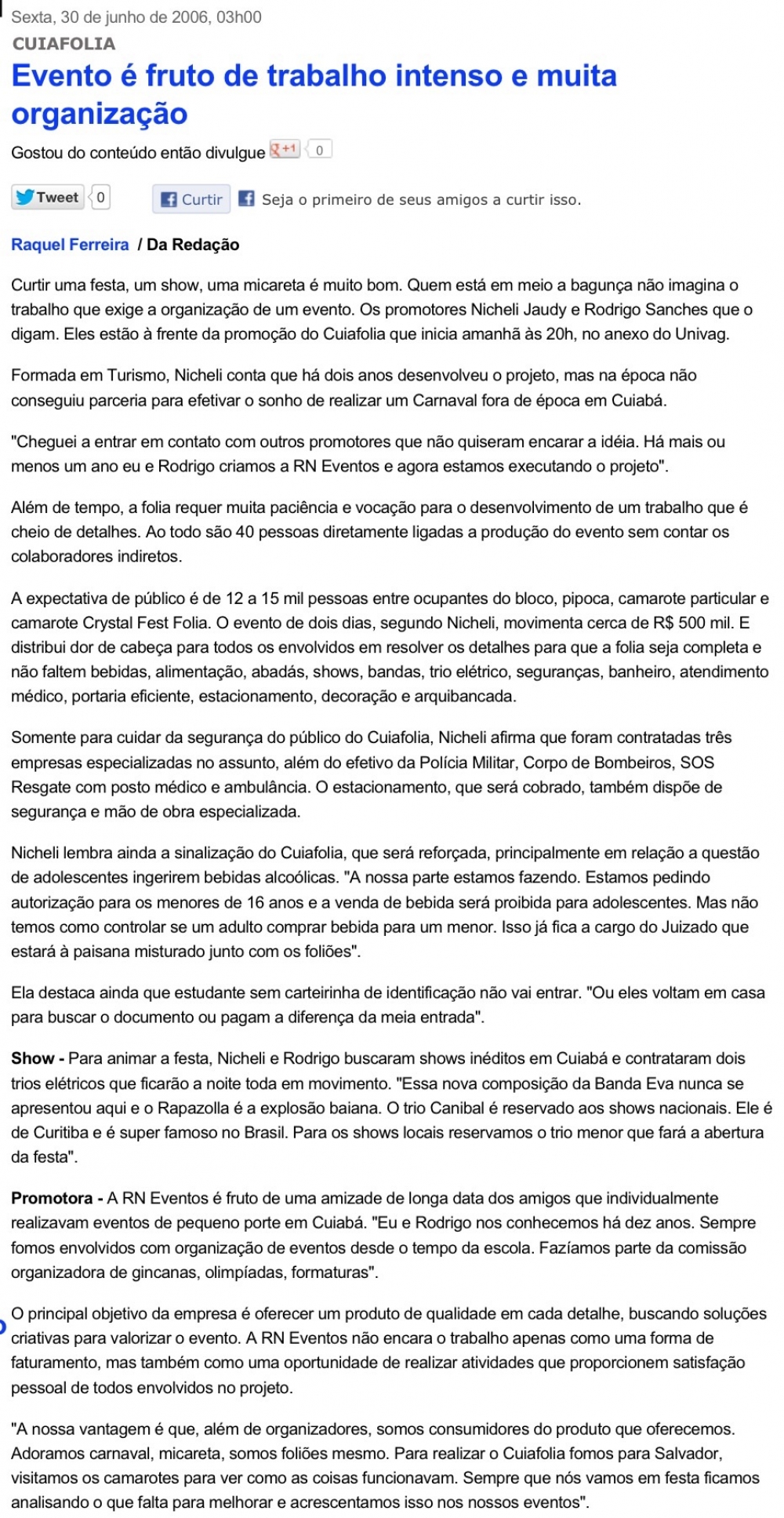 Em 2006 a empresária Nicheli Jaudy desenvolveu o projeto: Cuiafolia “Todos atrás do caminhão” realizando a primeira edição do evento, que contou com as bandas baianas Eva e Rapazolla reunindo cerca de 7 mil foliões. Em 2007 as bandas RapazolIa, Oz Bambaz e A Zorra animaram 11 mil pessoas em cada dia de folia e foi a partir daí que o projeto ganhou força sendo, inclusive, inserido no calendário cultural oficial de Cuiabá. Em 2008, o evento teve a sua terceira e ultima edição, com um publico recorde de 15 mil pessoas e foi considerado um dos melhores carnavais fora de época do Brasil.